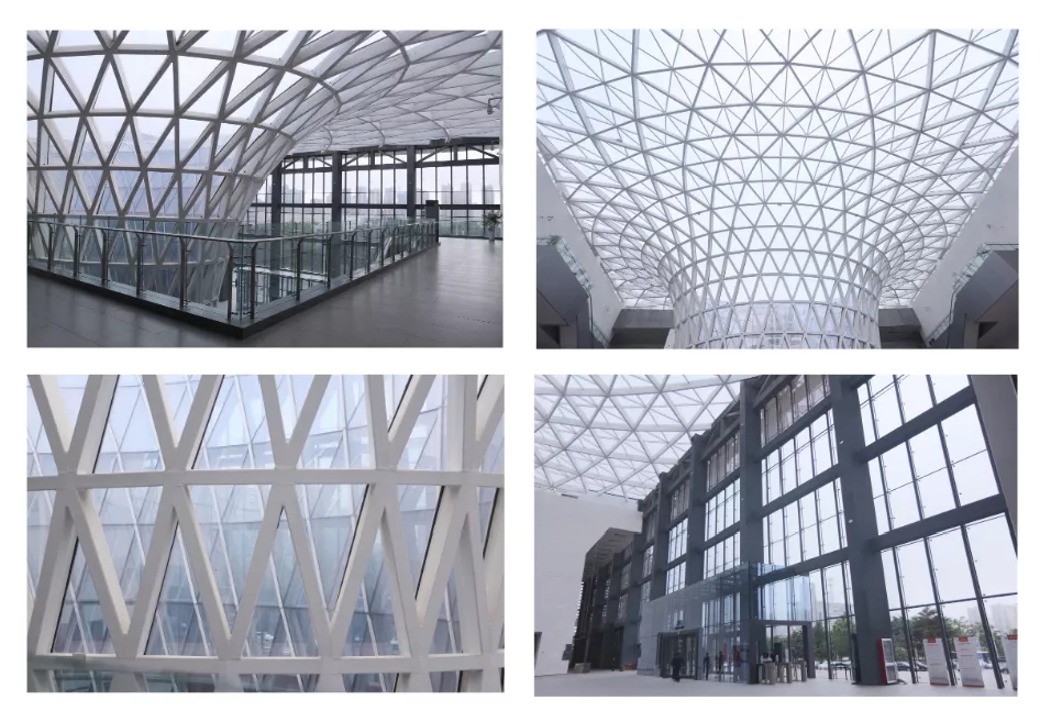 2.技術(shù)難點(diǎn):本項(xiàng)目功能綜合,根據(jù)不同功能區(qū)人員密集程度不同,設(shè)計(jì)不同的快捷疏散通道,同時(shí)能體現(xiàn)出八大展廳功能布置的合理及規(guī)范。外立面系部圓弧采用條型金屬板實(shí)現(xiàn),使轉(zhuǎn)角過度更加平滑;入口處采用鋼結(jié)構(gòu)空間桁架滿足建筑大懸挑和造型的要求;躍層的大廳采用鋼結(jié)構(gòu)玻璃頂,使之更加開敞明亮。